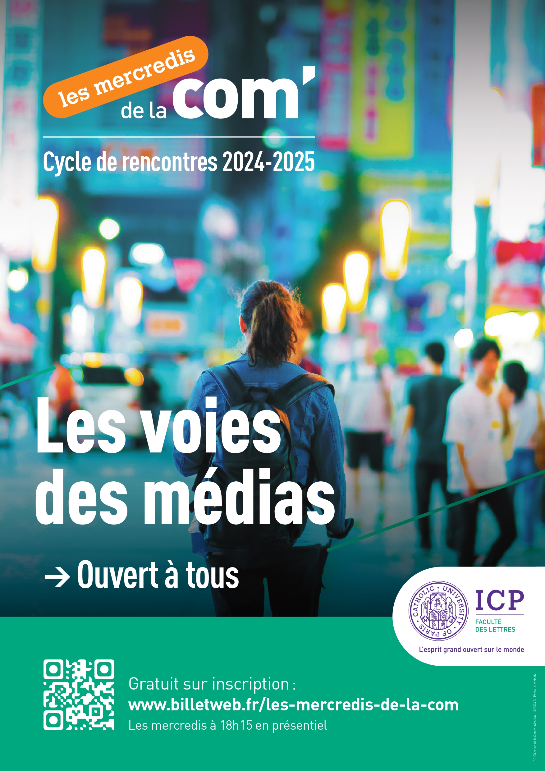 Destiné aux étudiants de la Licence Information et Communication et du Master Information - Communication : Écosystèmes médiatiques et transition numérique, mais également à ceux des Prépas journalisme et Celsa de l'ICP, ce cycle de rencontres est ouvert à toute personne intéressée par une réflexion autour des médias, du web, de l'information et de la communication. Elles permettent aux auditeurs d'élargir leur vision du secteur d'activité auquel ils se destinent.
